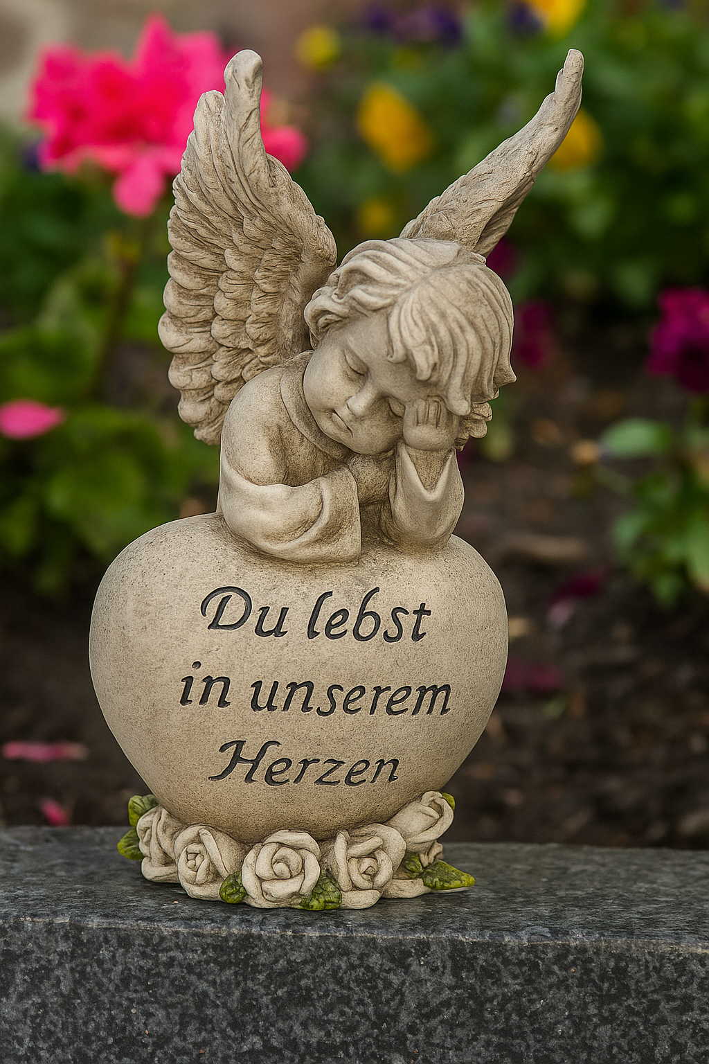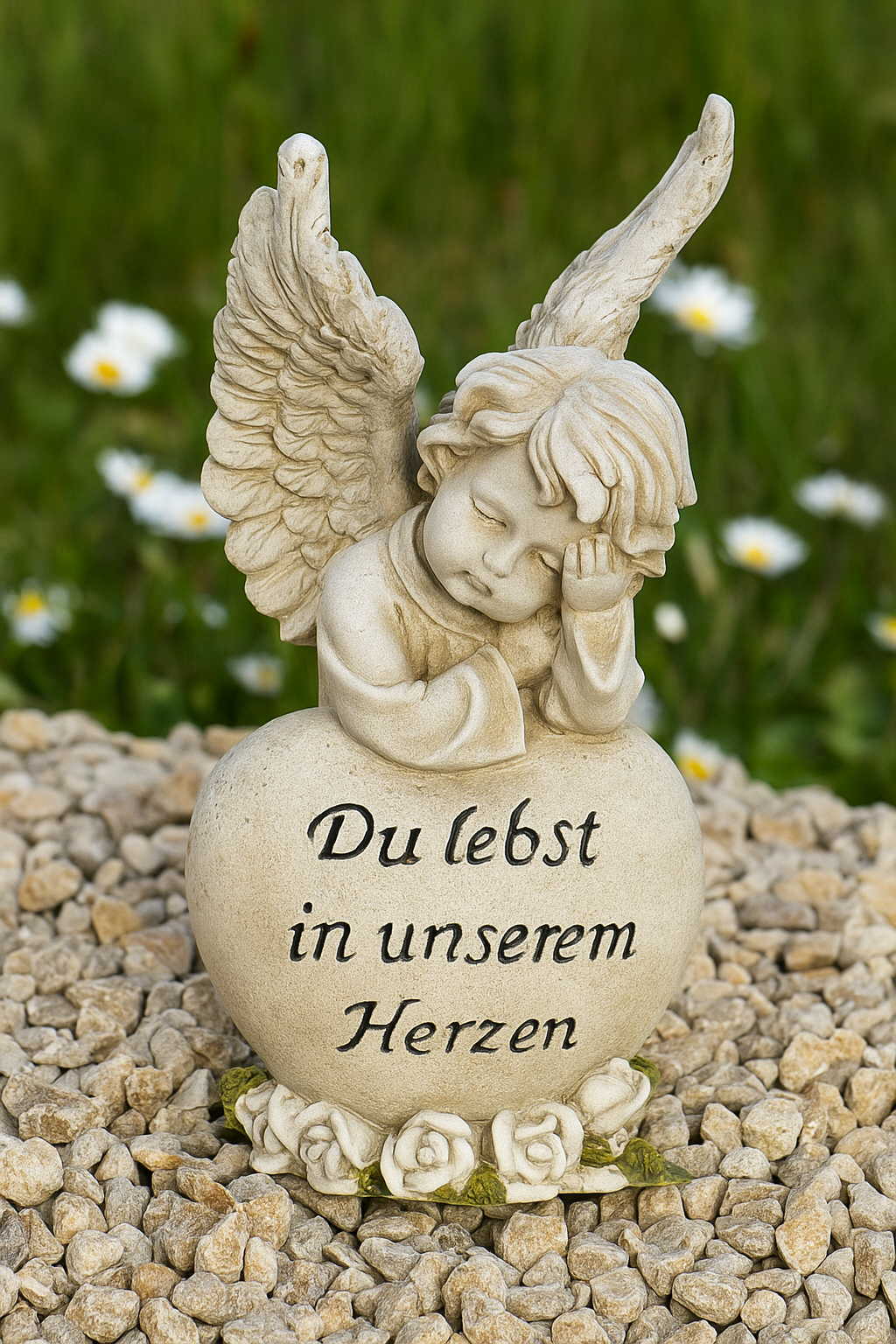 - Symbol der Erinnerung – Engel-Figur mit Herz und der Inschrift „Du lebst in unserem Herzen“, ideal als liebevolle Grabdeko