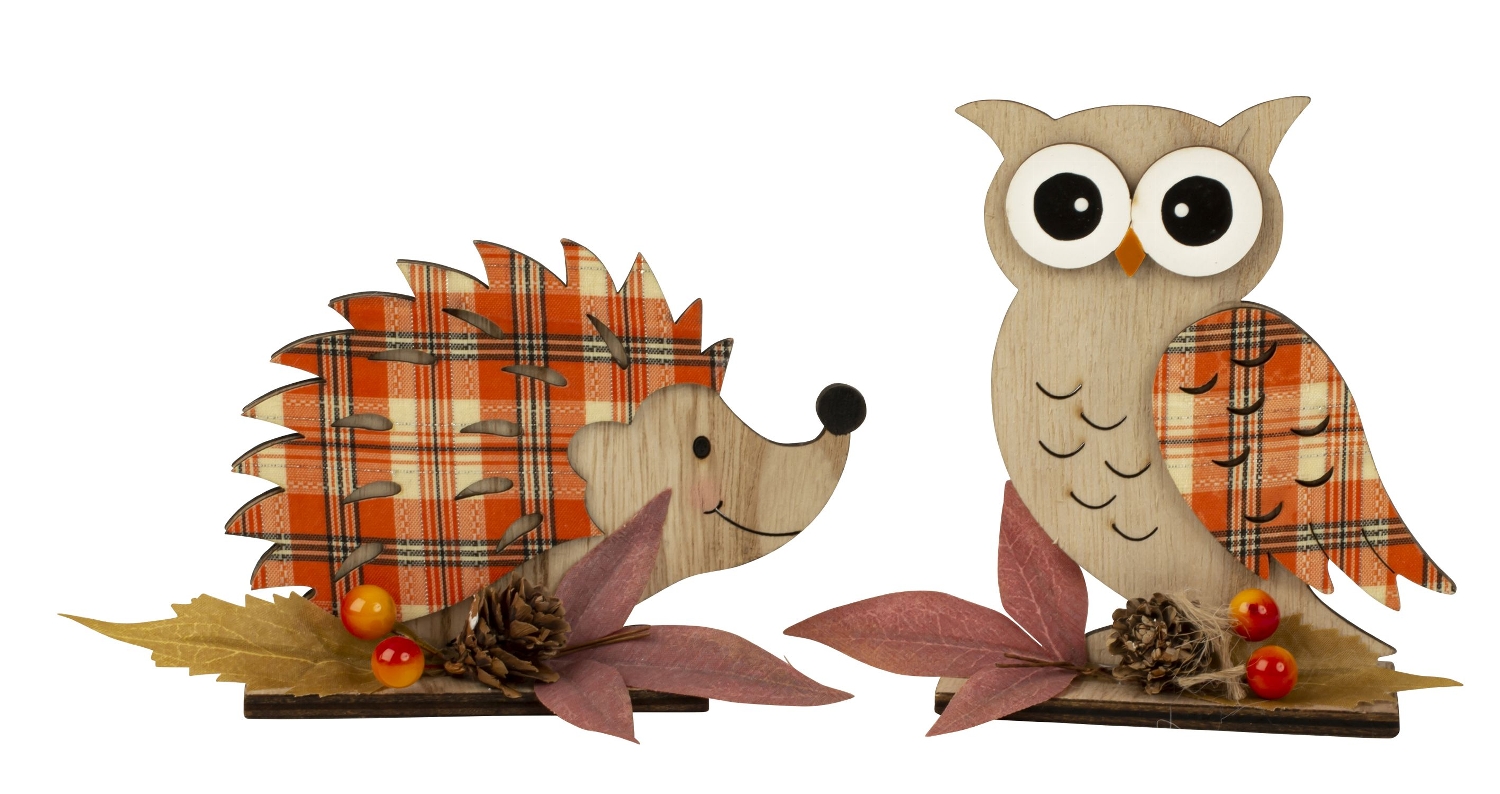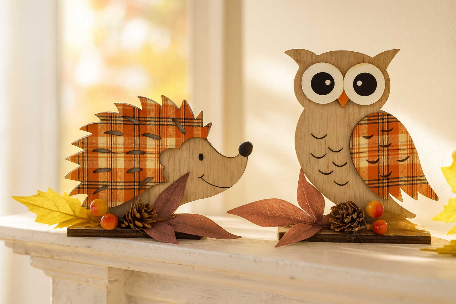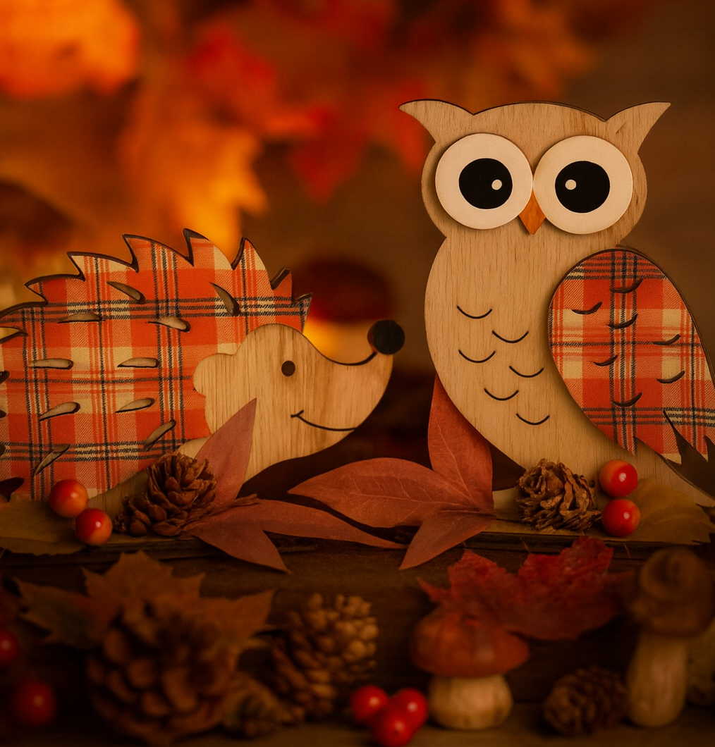 Produktbeschreibung: Diese liebevoll handgefertigten Holzfiguren – eine Eule und ein Igel – bringen herbstlichen Charme in jedes Zuhause. Mit ihrer warmen Farbgestaltung und den detailreichen Verzierungen eignen sie sich perfekt als Dekoration für Kamin, Fensterbank oder Tisch. Produktdetails: